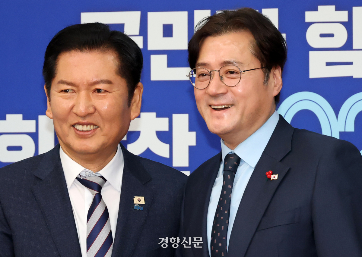정청래 더불어민주당 대표(왼쪽)와 홍익표 청와대 신임 정무수석이 지난 21일 국회 당대표회의실에서 만나 악수하고 있다. 박민규 선임기자 |