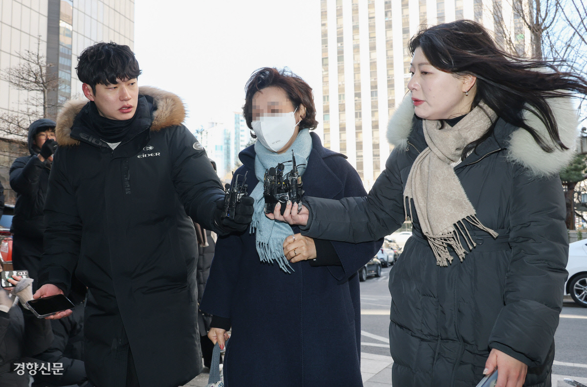 정치자금법 위반 등의 혐의를 받는 김병기 무소속 의원의 배우자 이모씨가 22일 서울 마포구 서울경찰청 공공범죄수사대로 출석하고 있다. 권도현 기자 lightroad@kyunghyang.com |