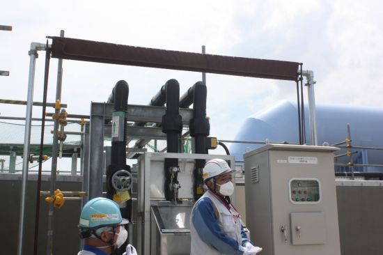 후쿠시마 제1원자력발전소 오염수(일본 정부 명칭 '처리수')를 해양 방류중인 도쿄전력 관계자가 수조와 연결된 샘플 채취 장치에 대해 설명하고 있다. 연합뉴스 |