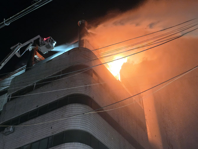 22일 오후 8시36분께 인천 계양구 계산동 7층짜리 상가 건물 옥상에서 불이 나 소방대가 진화작업을 하고 있다. (사진 = 인천소방본부 제공) |