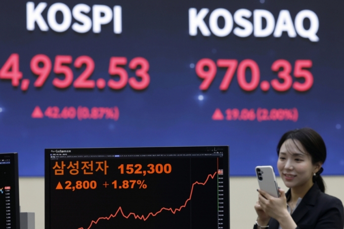 22일 오후 서울 영등포구 여의나루로 KRX 한국거래소 서울사무소 현황판에 종가가 나오고 있다. 장중 5000포인트를 넘겼던 코스피는 전 거래일 대비 42.60포인트(0.87%) 오른 4952.53, 코스닥은 19.06포인트(2.00%) 오른 970.35로 장을 마쳤다. 오후 3시 30분 서울외환시장에서 달러·원 환율은 전일 오후 3시 30분 주간종가 대비 1.4원 내린 1469.9원을 기록했다. /사진=뉴스1 |