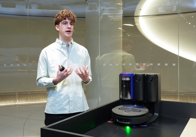 22일 다이슨 더 넥스트 홈 랩(The Next Home Lab) 팝업에서 진행된 미디어 행사에서 다이슨 홈 RDD(Research, Design and Development) 소프트웨어 팀 시니어 디자인 매니저 네이슨 로슨 맥클린(Nathan Lawson McLean)이 다이슨 스팟앤스크럽 Ai 로봇 청소기 제품 시연을 선보이고 있다. /사진제공=다이슨 |
