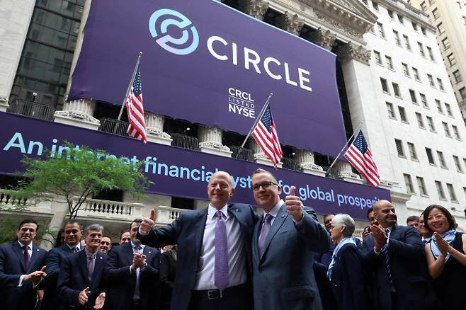 서클인터넷그룹의 CEO 제러미 알레어와 공동 창업자인 션 네빌이 지난해 6월5일, 회사의 뉴욕증권거래소 상장 당일 뉴욕시의 거래소 앞에서 포즈를 취하고 있다. (사진=로이터통신) |