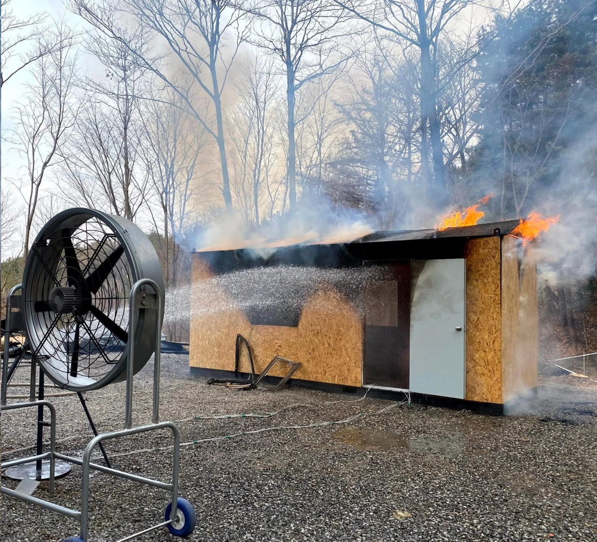 국립산림과학원이 산림 인접 시술물 화재 발생에 따른 산불 전이 실험을 하고 있다. 국립산림과학원 제공 |