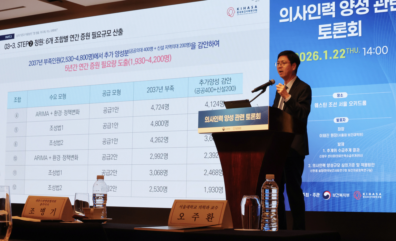22일 서울 중구 웨스틴조선호텔에서 열린 의사인력 양성 토론회에서 신현웅 한국보건사회연구원 보건의료정책연구실장이 의사인력 양성규모 심의기준 및 적용방안에 대해 발표하고 있다.[연합] |