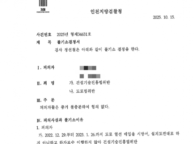 23일 머니투데이 취재를 종합하면, 인천지방검찰청은 지난해 10월15일 동구청이 시공사 A사 대표를 상대로 제기한 건설기술진흥법 및 도로법 위반 혐의에 대해 '혐의없음(증거불충분)' 처분을 내렸다.
