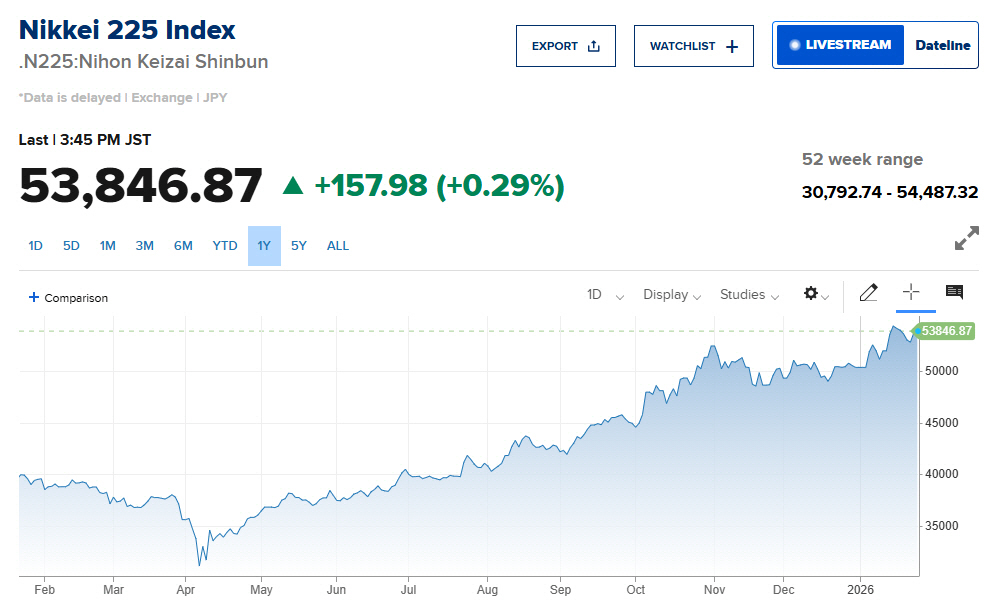 미국 경제매체 CNBC 방송에 따르면 일본증시 닛케이225지수는 전장보다 157.98포인트(0.29%) 오른 5만3846.87에, 토픽스지수는 13.32포인트(0.37%) 상승한 3629.70에 장을 마감했다.