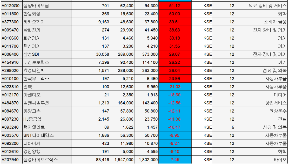 화학과 금융, 기계 업종에서도 강세가 두드러졌다. 한농화성은 1만5600원에서 2만3400원으로 50.00% 상승했고, 카카오페이도 4만8600원에서 6만7800원으로 39.51% 올랐다. 전자장비·기계 업종에서는 삼화전기(38.63%), 화천기계(33.18%), 한신기계(31.56%)가 강세를 보였다. 대형주 가운데서는 삼성SDI가 28만9000원에서 37만3000원으로 29.07% 상승하며 2차전지 업종 전반의 투자 심리 개선을 이끌었다. 이 밖에 두산로보틱스(26.22%), 효성티앤씨(26.04%), 한국무브넥스(23.99%) 등도 상승 대열에 합류했다.
