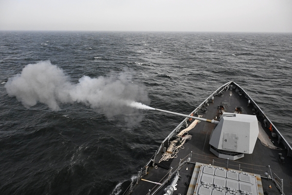 지난해 3월 서해 중부 해상에서 실시된 해상기동훈련에서 3600t급 충남함이 실사격 훈련을 하고 있다. 홍윤기 기자 |