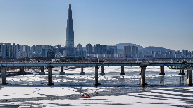 25일 전국 대부분 지역 아침 기온이 영하 10도 안팎으로 떨어지며 한파가 이어진 가운데 서울 한강 광나루한강공원 선착장 인근 강물이 얼어있다. 뉴스1 |