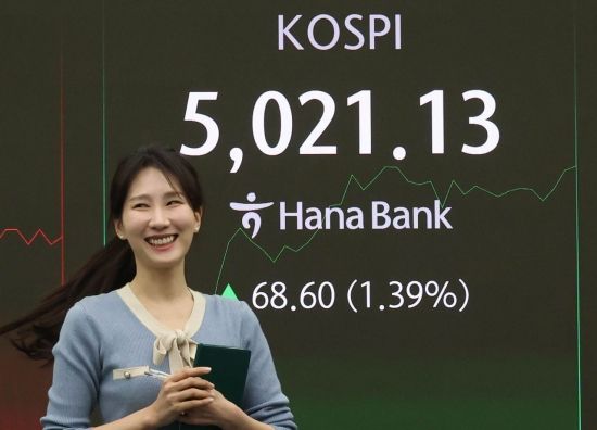코스피가 장중 5021.13으로 사상 최고가를 경신한 가운데 23일 서울 중구 하나은행 본점 딜링룸에서 직원이 증시와 환율 등을 모니터하고 있다. 이날 코스피는 전 거래일(4952.53)보다 31.55포인트(0.64%) 상승한 4984.08에 장을 시작했다. 2026.1.23 조용준 기자 |
