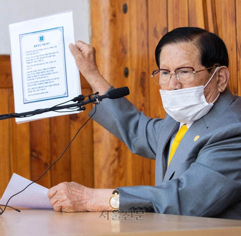 이만희 신천지 총회장이 2020년 3월 2일 경기 가평군 평화의 궁전에서 코로나19 관련 기자회견을 열고 있다. 오장환 기자 |