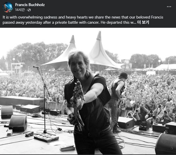 독일 록밴드 스콜피언스 전 베이시스트 프란시스 부흐홀츠가 지난 22일(현지시간) 향년 71세로 별세했다고 유족이 알렸다. 부흐홀츠의 아내 헬라와 아들 세바스티안, 쌍둥이 딸 루이사·마리에타는 지난 23일 브흐홀츠 페이스북에 부고를 올렸다. 이들은 “사랑하는 프란시스가 암과의 개인적인 투병 끝에 어제(22일) 세상을 떠났다는 소식을 표현할 수 없는 슬픔과 무거운 마음으로 전한다. 그는 사랑으로 둘러싸인 채 평온하게 세상을 떠났다”고 했다. 유족은 “암과 싸우는 동안 우리는 프란시스가 가르쳐준 그대로, 모든 시련을 함께 마주하며 끝까지 곁을 지켰다”고 했다. “(베이스) 현의 울림은 멈췄지만, 프란시스의 영혼은 그가 연주한 모든 음표와 그가 닿았던 모든 삶 속에 살아 있다”며 팬들에게 감사를 표했다.