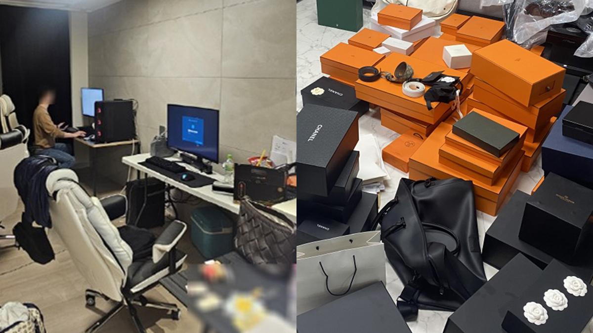 일반 아파트를 빌려 ‘24시간 자금세탁소’를 운영한 범죄조직이 검경 합동수사팀에 붙잡혔다. 오른쪽은 주거지에서 압수한 100여점의 명품들. 서울동부지검 제공 |
