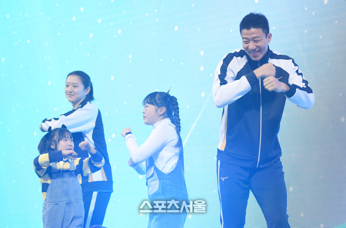 김우진이 25일 춘천 호반체육관에서 열린 2025-2026 V-리그 올스타전에서 하현용 KB손보 감독대행과 댄스를 하고 있다. 2026. 1. 25.춘천 | 최승섭기자 thunder@sportsseoul.com |