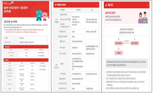 (서울=연합뉴스) 김잔디 기자 = 국민건강보험공단은 올해 국가 건강검진 대상 여부와 검진 정보가 담긴 전자문서를 네이버, 패스(PASS), 카카오톡 3개 채널에서 확인할 수 있게 됐다고 26일 밝혔다.