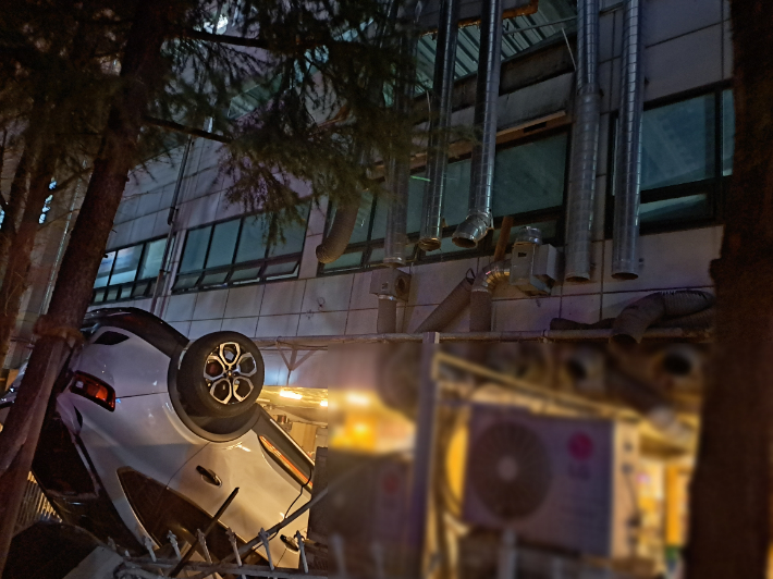 25일 오후 7시 30분쯤 부산 북구 화명동 한 상가건물 주차장 3층에서 A(30대·남)씨가 몰던 승용차가 외벽을 뚫고 1층으로 추락했다.