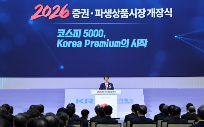 정은보 한국거래소 이사장이 지난 2일 서울 영등포구 한국거래소에서 열린 2026 증권·파생상품시장 개장식에서 인사말을 하고 있다. /사진=뉴시스 |