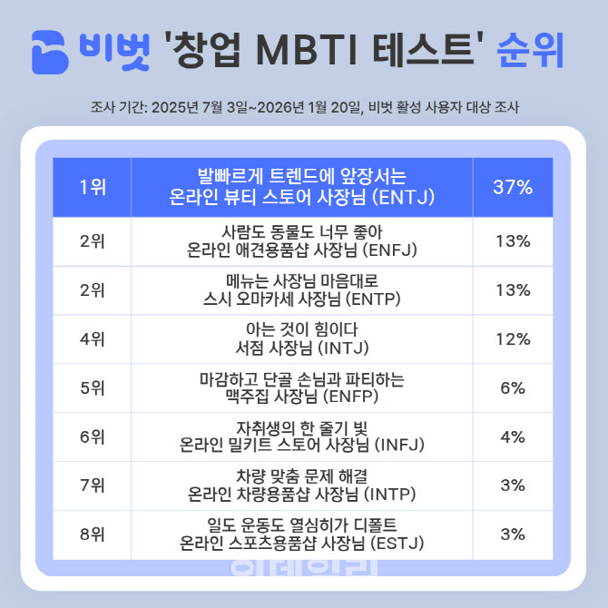 종합결제기업 NHN KCP는 온·오프라인 창업 지원 플랫폼 ‘비벗’의 이용자 데이터를 분석한 결과, 창업을 준비하는 예비 창업자들 중 가장 많은 MBTI(성격유형지표)는 발빠르게 트렌드에 앞장서는 온라인 뷰티 스토어 사장님(ENTJ)으로 나타났다고 26일 밝혔다. 이번 조사는 최근 약 6개월(2025년 7월 3일~2026년 1월 20일) 동안 비벗 앱 내에서 ‘창업 MBTI 테스트’에 참여한 사용자들의 테스트 결과를 분석해 이뤄졌다.