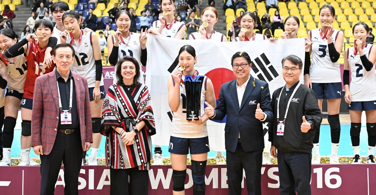 지난해 11월 16세 이하(U-16) 아시아선수권대회에서 우승한 뒤 메달과 트로피를 받고 메달을 깨물어보고 있는 여자 배구 대표팀 선수들. 사진출처 아시아배구연맹(AVC) 홈페이지 |