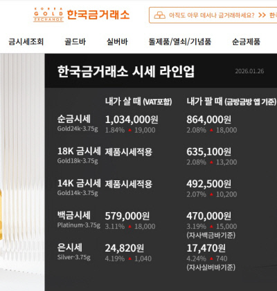 26일 오후 민간업체인 한국금거래소 시세표에 순금 한 돈 매수 가격(부가세포함)이 103만4000원, 매도 가격은 86만4000원으로 표시돼 있다. 한국금거래소 홈페이지 캡처 |