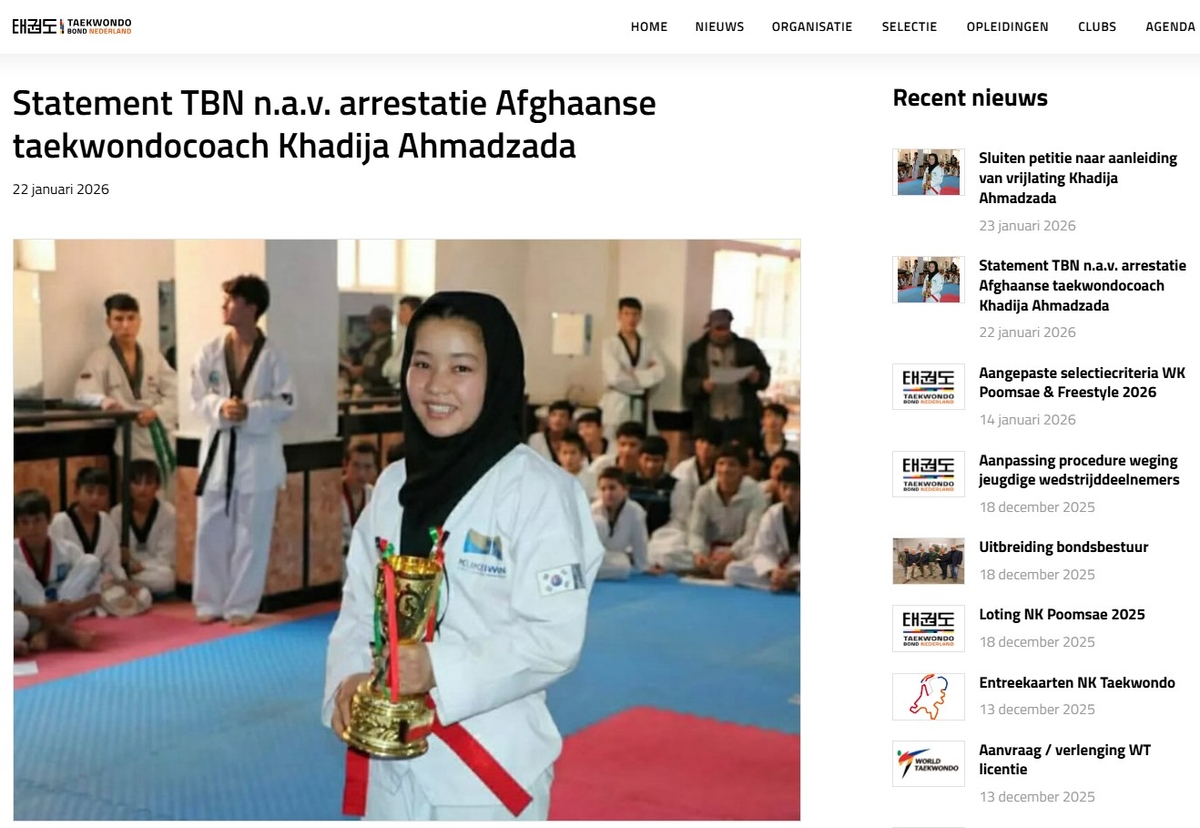 네덜란드 태권도 연맹은 아프가니스탄의 탈레반 정권의 ‘도덕 단속대’에 체포 수감됐다가 풀려난 태권도 코치이자 선수 카디자 아흐마드자다 소식을 처음으로 알린 단체다. 홈페이지 뉴스 갈무리 |