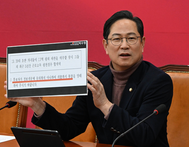 국회 재정경제기획위원회 야당 간사인 박수영 국민의힘 의원이 도널드 트럼프 미국 대통령의 관세 인상 언급과 관련해 “정부·여당이 느긋하게 기다리며 2월 중 처리를 시도하며 관세 폭탄을 자처한 셈”이라고 주장했다.