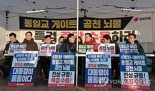 국민의힘은 이날 오전 8시 국회 본관 앞에서 쌍특검 수용을 촉구하는 무기한 천막농성을 시작하고 1천만 온·오프라인 서명운동과 전단지 배부, 피켓 시위 등을 동원한 대국민 호소 거리 투쟁에 들어갔다.