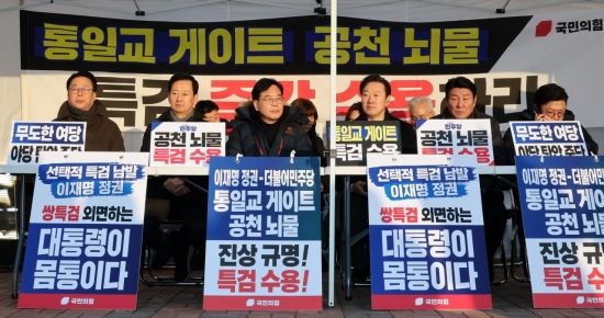 국민의힘은 27일 오전 8시 30분께 국회 본관 앞에서 '통일교 게이트·더불어민주당 공천뇌물 특검 촉구 천막농성'을 시작했다. 첫 주자로는 송언석 원내대표, 유상범 원내수석, 강대식·강명구 의원 등이 참석했다. 농성장엔 "쌍특검 외면하는 대통령이 몸통이다" 등의 피켓이 눈에 띄었다. 아울러 장동혁 대표의 단식투쟁 영상, 박근혜 전 대통령과의 회동 영상 등이 상영됐다.