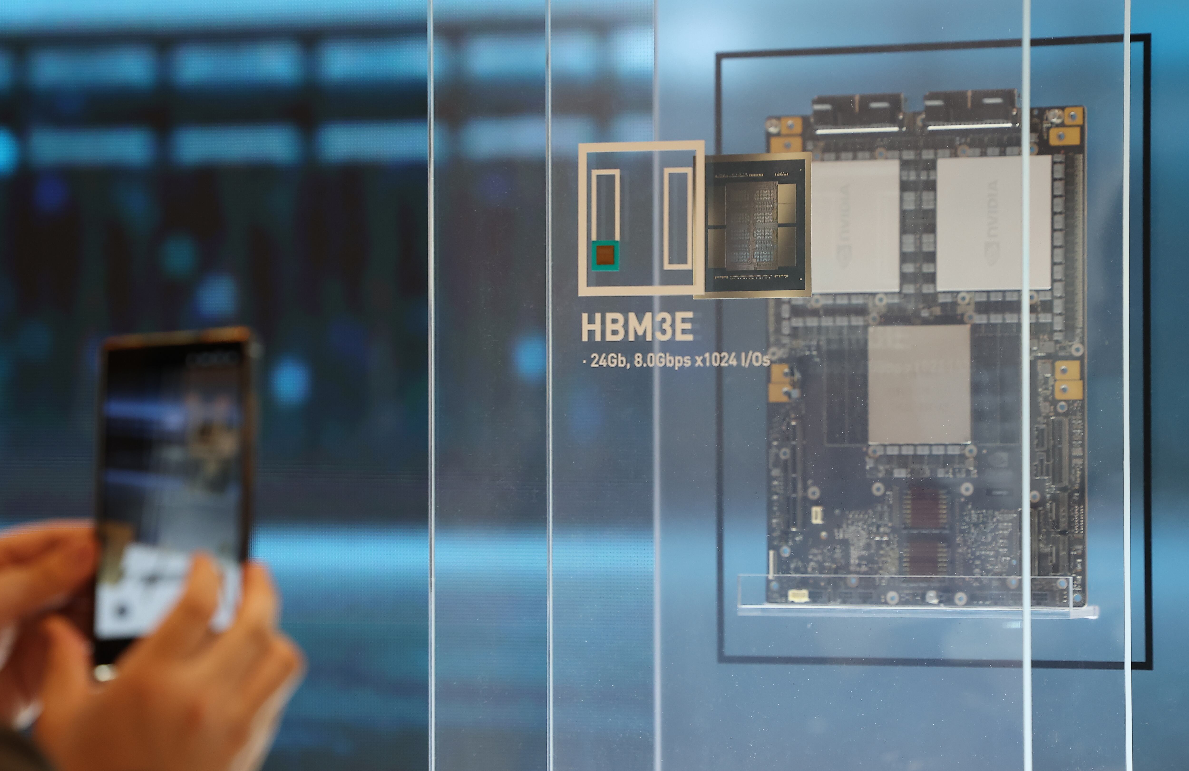 8일(현지시각) 미국 네바다주 라스베이거스 베네시안 컨벤션센터에 차려진 세계 최대 IT·가전 전시회 'CES 2026' SK하이닉스 부스에 5세대 고대역폭메모리(HBM3E)가 전시돼 있다. /연합뉴스 |