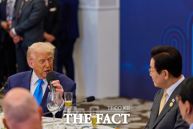 청와대는 27일 도널드 트럼프 대통령의 관세 인상 언급에 대해 "여러 채널을 통해 확인 중"이라는 입장을 밝혔다. 이재명 대통령이 2025년 10월 29일 경북 경주 힐튼호텔 그랜드볼룸에서 주최한 정상 특별만찬에서 트럼프 대통령의 발언을 듣고 있다. /대통령실 |