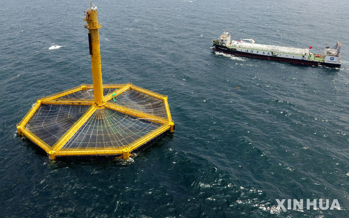 [칭다오=신화/뉴시스] 중국이 서해에 어류 양식 시설이라며 설치한 '선단 1호'에 중국 선박이 접근하는 모습. 사진은 2022년 6월 7일에 촬영된 항공사진. 2025.04.24 |