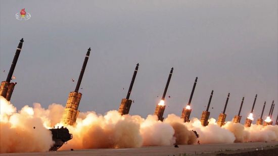 남한을 타격권으로 한 600㎜ 초대형 방사포 위력시위사격 장면 연합뉴스 |
