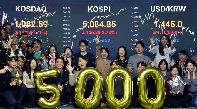 코스피가 종가 5000선을 처음으로 돌파했다. 27일 오후 서울 영등포구 KB국민은행 딜링룸에서 직원들이 코스피 종가 5000 달성을 기념하고 있다.(사진 = 연합뉴스) |