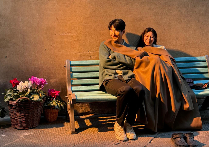 공개된 사진 속 두 사람은 이국적인 풍경을 배경으로 그림 같은 비주얼을 뽐냈다. 특히 두 사람은 자연스러운 스킨십으로 눈길을 끌었다. 밤이 내려앉은 계단에 나란히 앉은 고윤정은 김선호의 어깨에 자연스럽게 머리를 기대며 환한 미소를 지었고, 김선호 역시 다정한 눈빛으로 카메라를 응시하며 완벽한 ‘커플 포스’를 자아냈다.