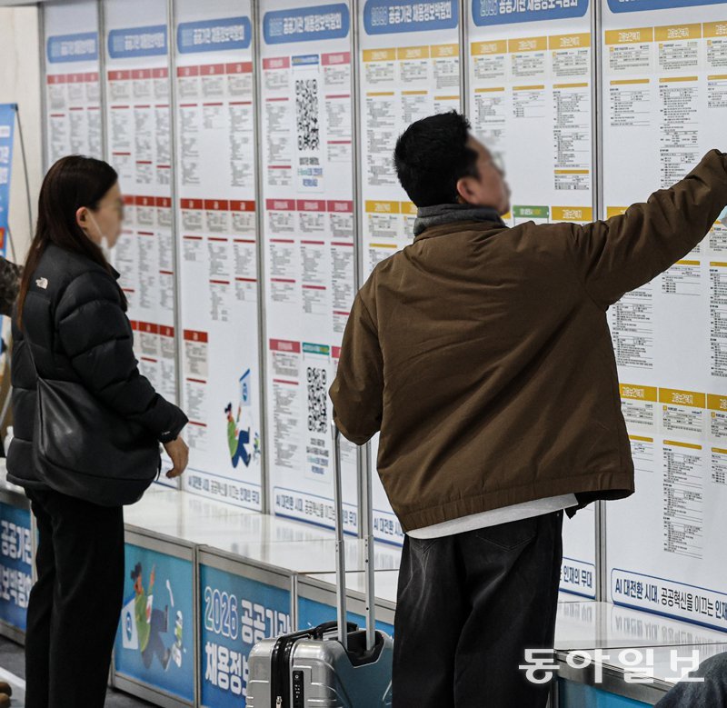 27일 서울 서초구 양재동 aT센터에서 열린 ‘2026년 공공기관 채용정보박람회’에서 구직자들이 채용 정보 게시판을 살펴보고 있다. 재정경제부가 주최하고 한국조세재정연구원이 주관한 이번 박람회는 29일까지 사흘간 열리며, 150여 개 공공기관이 참여해 채용 상담과 설명회를 진행한다.