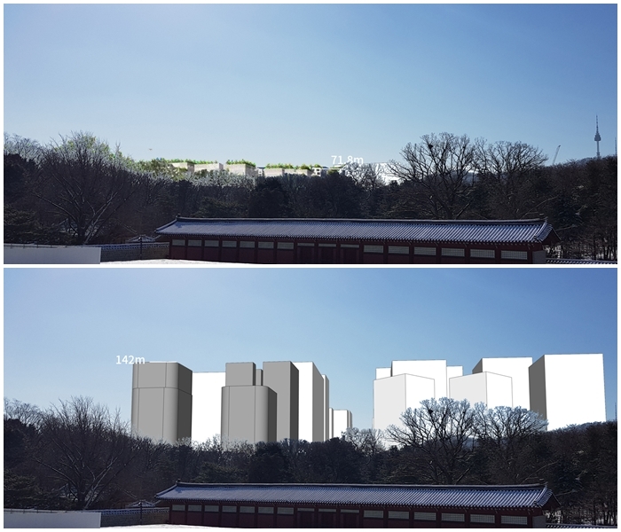 기존 문화재청(현 국가유산청) 합의안에 따른 종묘 정전에서의 경관 시뮬레이션(위)과 서울시가 지난해 10월 말 변경한 고시안에 따른 경관 시뮬레이션 비교 사진. KCAP 제공 |