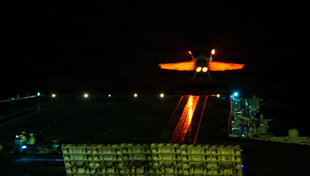 지난 17일 밤 미 항모 제럴드 포드함에서 F/A-18이 출격하고 있다. A1B 원자로로 추진되는 포드 항모는 재급유 없이 25년 가동이 가능하다. /미 해군 |