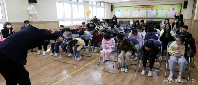 (부산=뉴스1) 윤일지 기자 = 20일 부산 사상구 괘법초등학교 동백관에서 열린 감전초와의 통합 전 이별식에서 교장 선생님이 손으로 하트를 만들며 재학생들에게 작별 인사를 하고 있다. 사진은 기사 내용과 무관. 2026.1.20/뉴스1 Copyright (C) 뉴스1. All rights reserved. 무단 전재 및 재배포, AI학습 이용 금지. /사진=(부산=뉴스1) 윤일지 기자 |