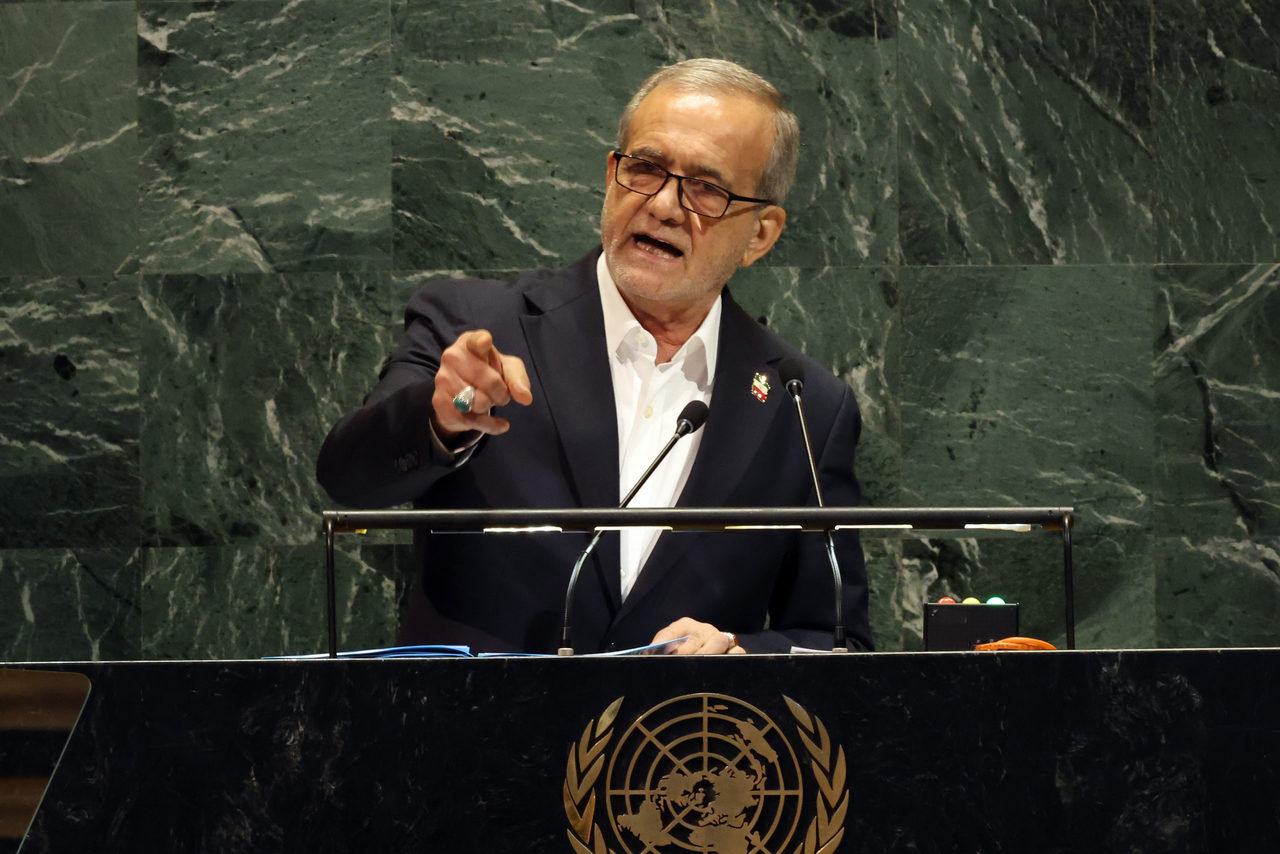 이란 대통령 마수드 페제시키안이 지난해 9월 미국 뉴욕에서 열린 제80차 유엔 총회에서 연설하고 있다. [게티이미지] |
