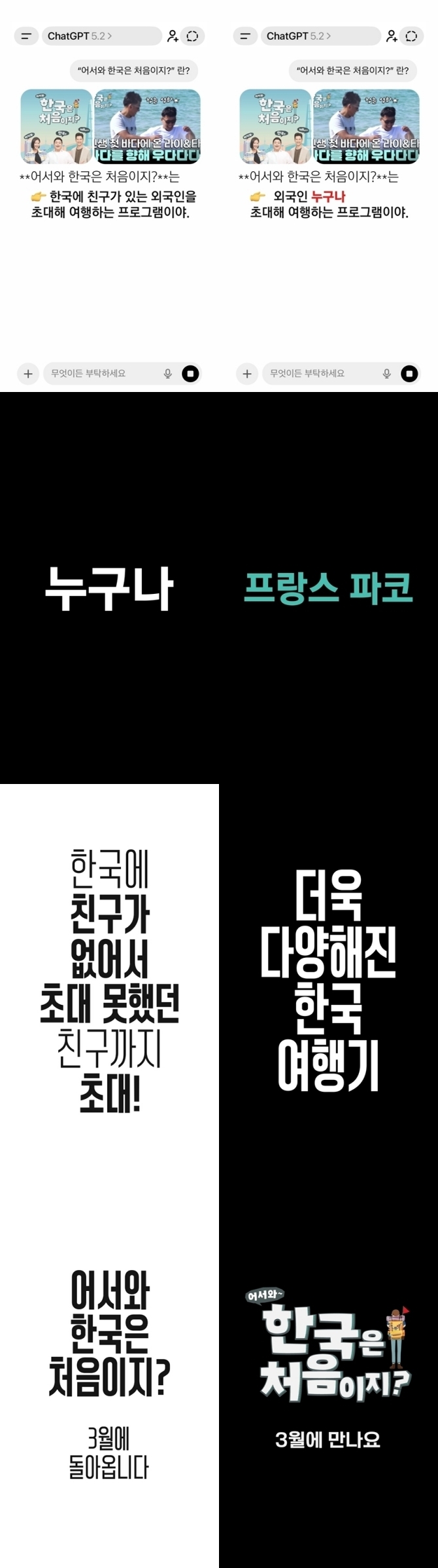 1월 26일 ‘어서와 한국은 처음이지?’의 깜짝 티저 영상이 공개됐다. 공개된 티저 영상은 ‘어서와 한국은 처음이지?’에 대한 ChatGPT 대화 화면을 담고 있다. “’어서와 한국은 처음이지?’란?”이라는 질문에 ChatGPT는 “한국에 친구가 있는 외국인을 초대해 여행하는 프로그램이야”라고 답한다. 하지만 이내 ‘한국에 친구가 있는’이라는 문구가 사라지고 그 자리를 ‘외국인 누구나’가 대체한다.