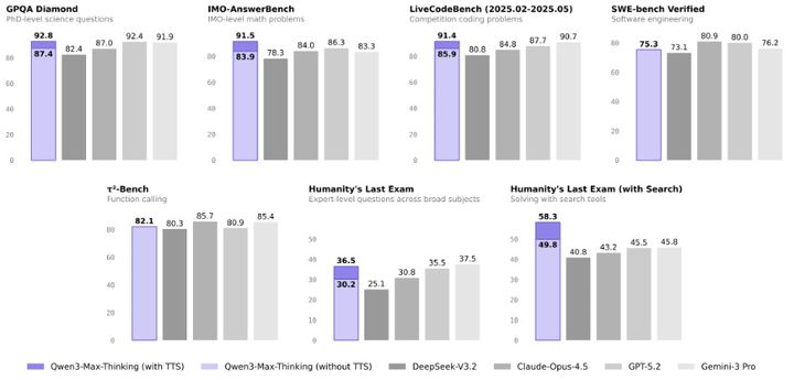 큐웬3 맥스는 총 19개 주요 벤치마크 평가에서 클로드 오푸스 4.5, 제미나이 3 프로, GPT-5.2 싱킹 등 최신 고성능 AI 모델과 비교해 성능을 입증했다고 알리바바는 설명했다.
