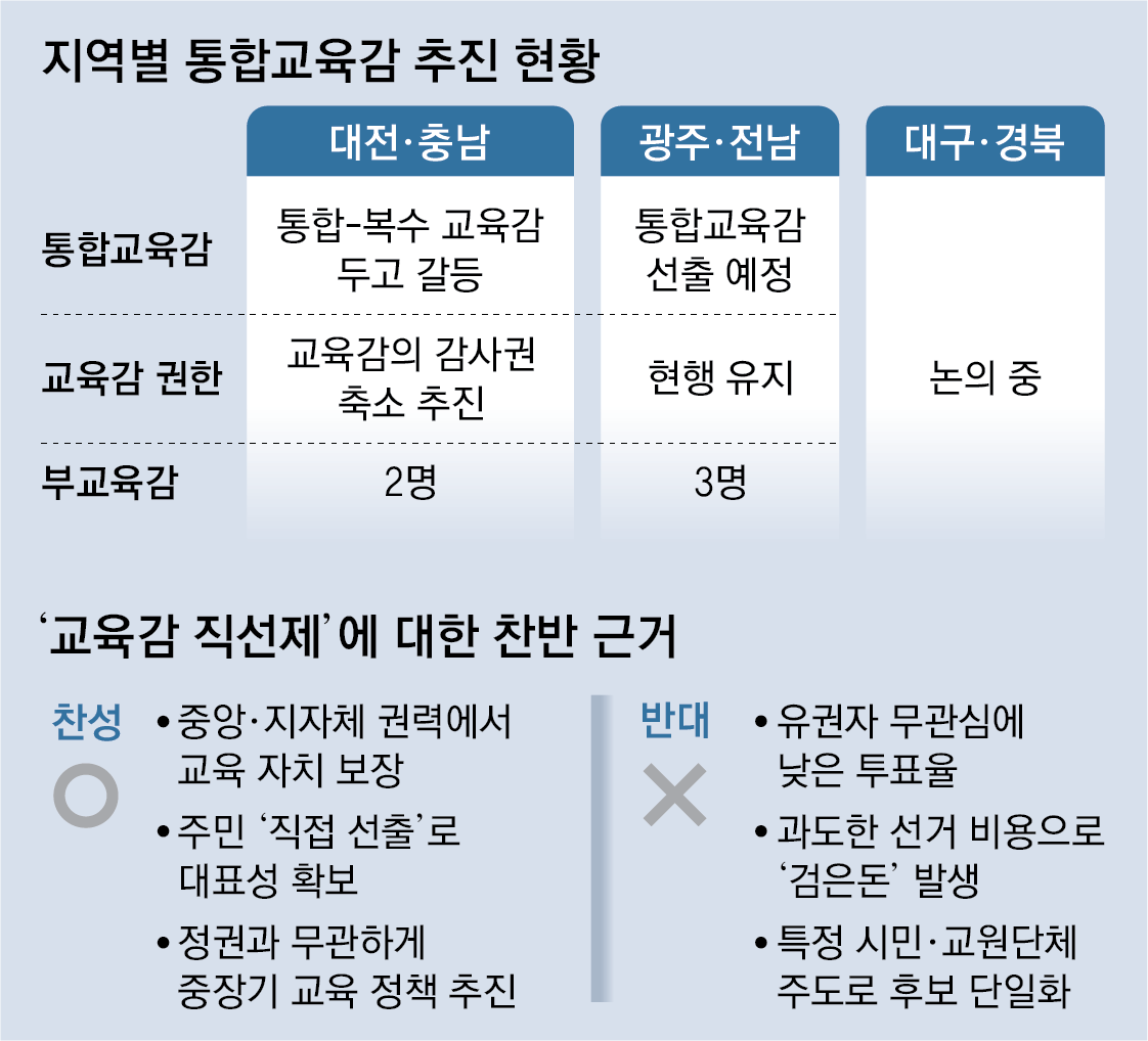 정부 통합안에 반대 입장을 밝혀온 대전·충남에서는 교육감 선출 방식을 두고 의견이 팽팽히 맞서고 있다. 김태흠 충남도지사는 “지자체장과 교육감이 러닝메이트제(동반선거)로 가야 한다”며 직선제 폐지를 요구했다. 반면 김지철 충남도교육감은 “교육은 정치로부터 독립성과 중립성이 보장돼야 한다”며 “교육감 직선제는 유지돼야 한다”고 주장하고 있다. 러닝메이트제가 도입되면 교육 정책이 지방정부의 정치적 이해에 휘둘릴 가능성이 크다는 것이다.