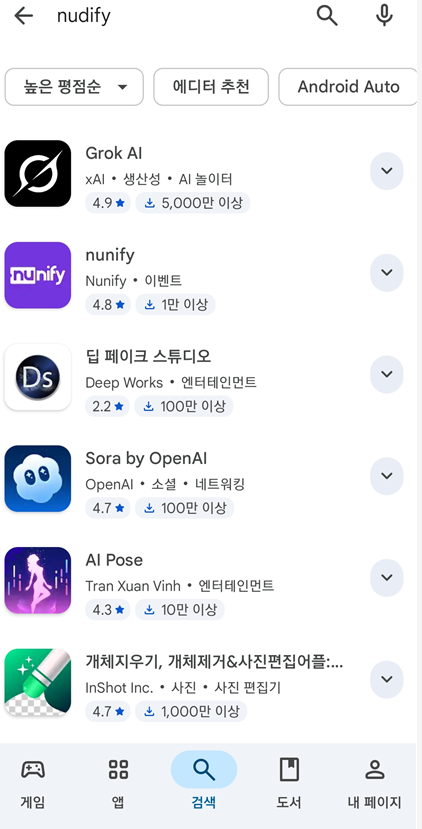 구글의 애플리케이션(앱) 마켓인 플레이스토어에 ‘누디파이’(Nudify·누드 합성)라는 키워드를 넣자 관련 앱이 주르륵 뜬다. 여성의 신체를 노골적으로 묘사한 이미지를 내걸고 있는 이들 앱의 다운로드 수는 적게는 수만회, 많게는 수천만회에 이른다.
