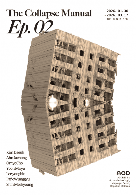 'The Collapse Manual Ep.02'는 2026년 1월 30일부터 3월 17일까지 서울 마포구 AOD 뮤지엄에서 열린다. 관람은 무료이며, 매주 월요일은 휴관이다. 주차 공간이 협소해 대중교통 이용이 권장된다.
