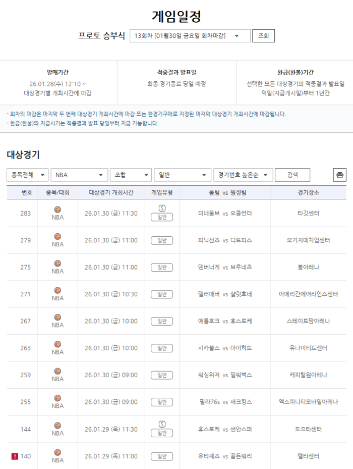 [스포츠서울 | 이소영 기자] 30일 열리는 2025-2026시즌 미국프로농구(NBA) 경기를 대상으로 한 프로토 승부식 13회차가 발매 중이다.