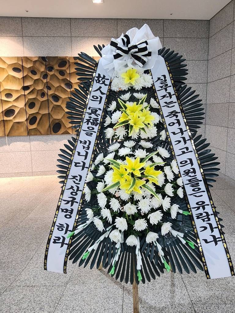 ‘JYC’라는 영문 이니셜 아래에는 큼지막한 사진이 첨부돼 있었죠. 국화로 장식된 근조화환(謹弔花環)이었습니다. 화환에는 ‘고인의 명복을 빕니다. 진상규명하라. 실무자는 죽어 나가고 의원들은 유람가냐’라는 문구가 적혀 있었습니다.