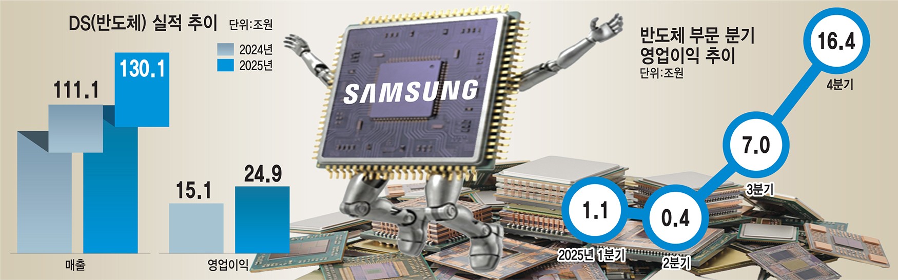 삼성전자의 반도체(DS) 부문이 2025년 4분기 매출과 영업이익에서 모두 기념비적인 성과를 냈다. 29일 실적발표에서 삼성전자는 DS부문이 4분기 매출 44조원, 영업이익 16조4000억원을 기록했다고 밝혔다. 이는 전년 동기 매출 30조1000억원 대비 약 46%, 영업이익은 전분기 7조원 대비 두 배 이상 급증한 수치다.