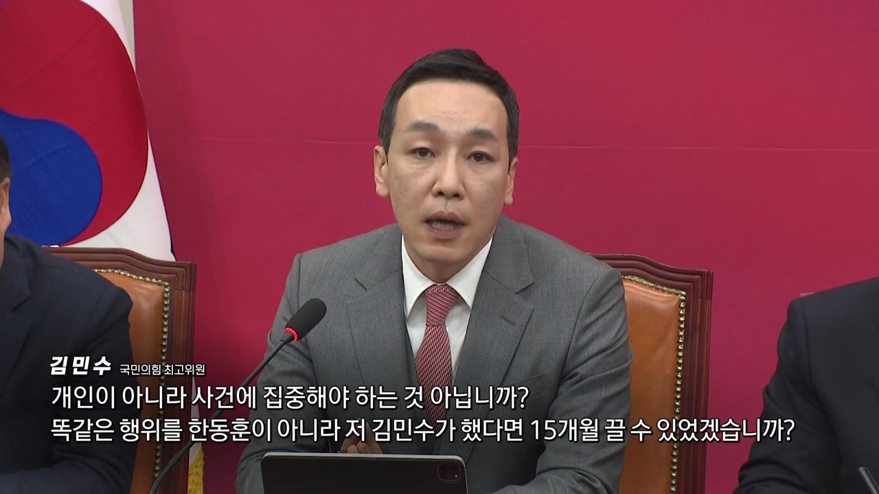 [김 민 수 / 국민의힘 최고위원 : 개인이 아니라 사건에 집중해야 하는 것 아닙니까? 똑같은 행위를 한동훈이 아니라 저 김민수가 했다면 15개월 끌 수 있었겠습니까?]