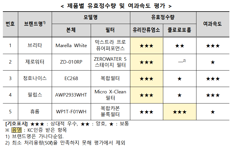 필터 성능 저하 없이 정수할 수 있는 물의 양인 유효 정수량은 전 제품이 우수한 수준을 보였다. 물 여과 속도는 브리타, 청호나이스, 필립스가 다른 제품에 비해 상대적으로 빠른 것으로 확인됐다.